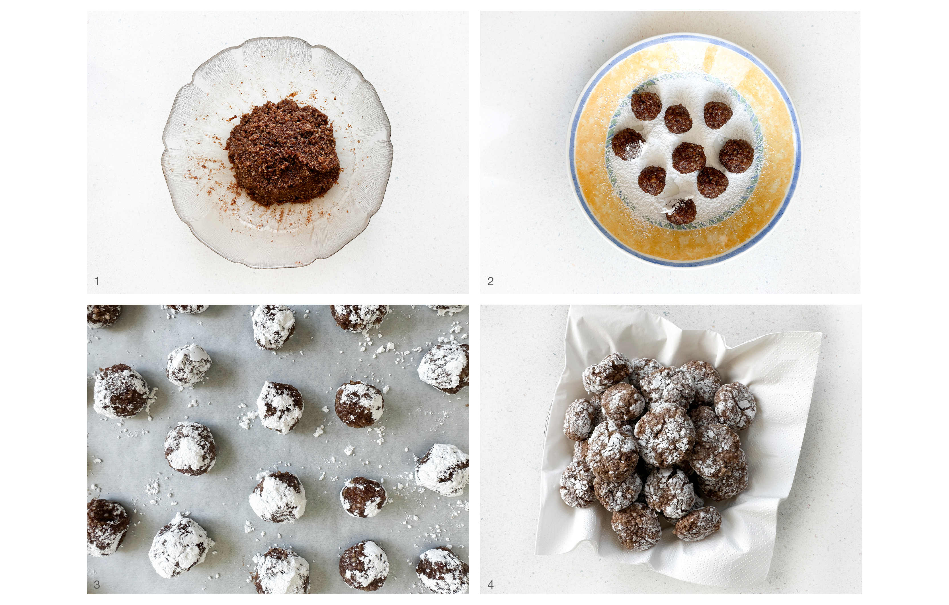 Aus der klebrigen Masse werden nun kleine Kugeln geformt. Dazu nimmt man am besten etwa einen halben Teelöffel Teig pro Kugel. Die fertigen Kugeln werden direkt grosszügig in Puderzucker gewälzt und auf einem mit Backpapier ausgelegtem Backblech platziert. Etwas Abstand zwischen den einzelnen Kugeln lassen, denn die Kekse gehen beim Backen auf. Die kleinen Kugeln anschliessend mit dem Finger leicht flach drücken, damit die Kekse die klassische Amarettini Form erhalten. Anschliessend werden sie im Backofen gebacken.